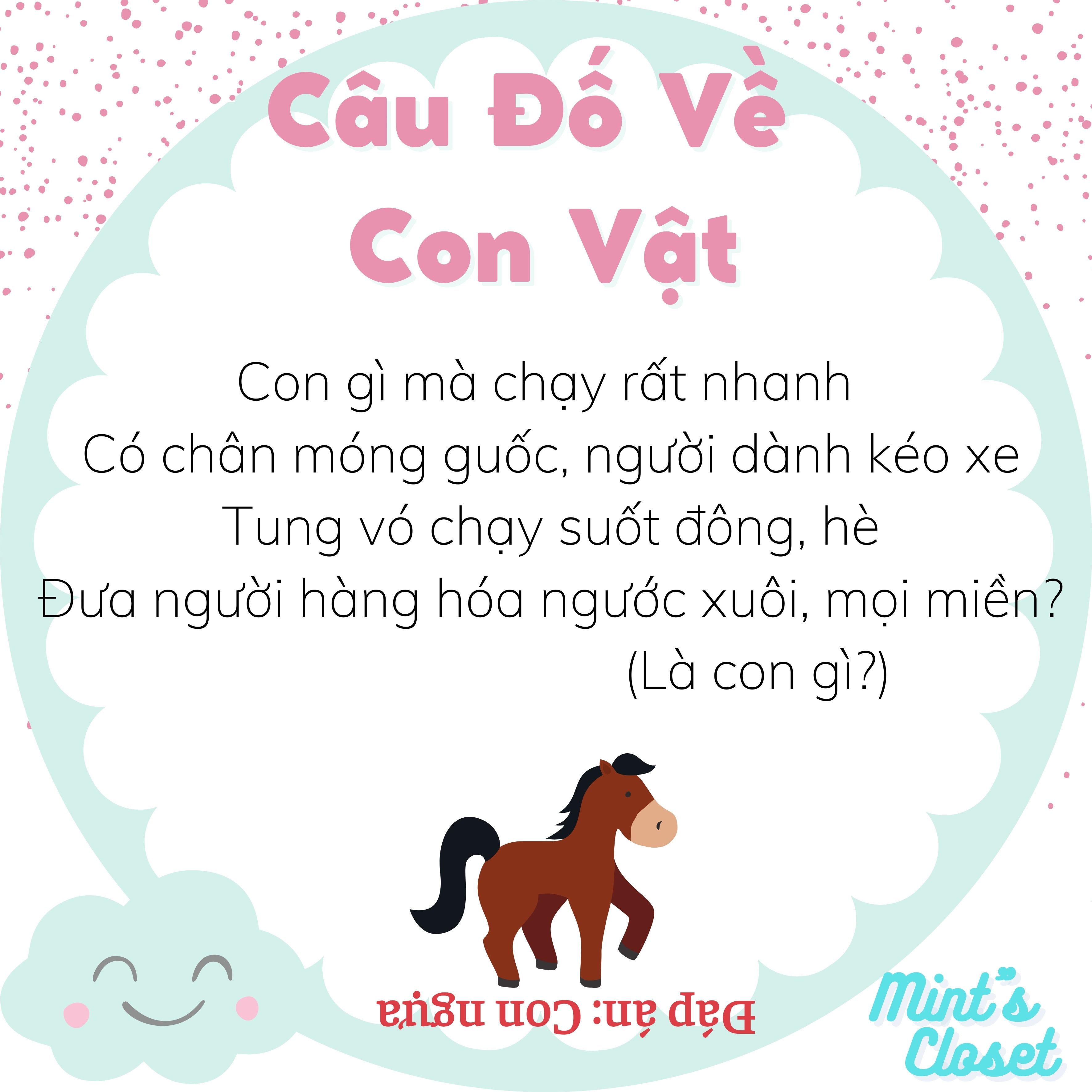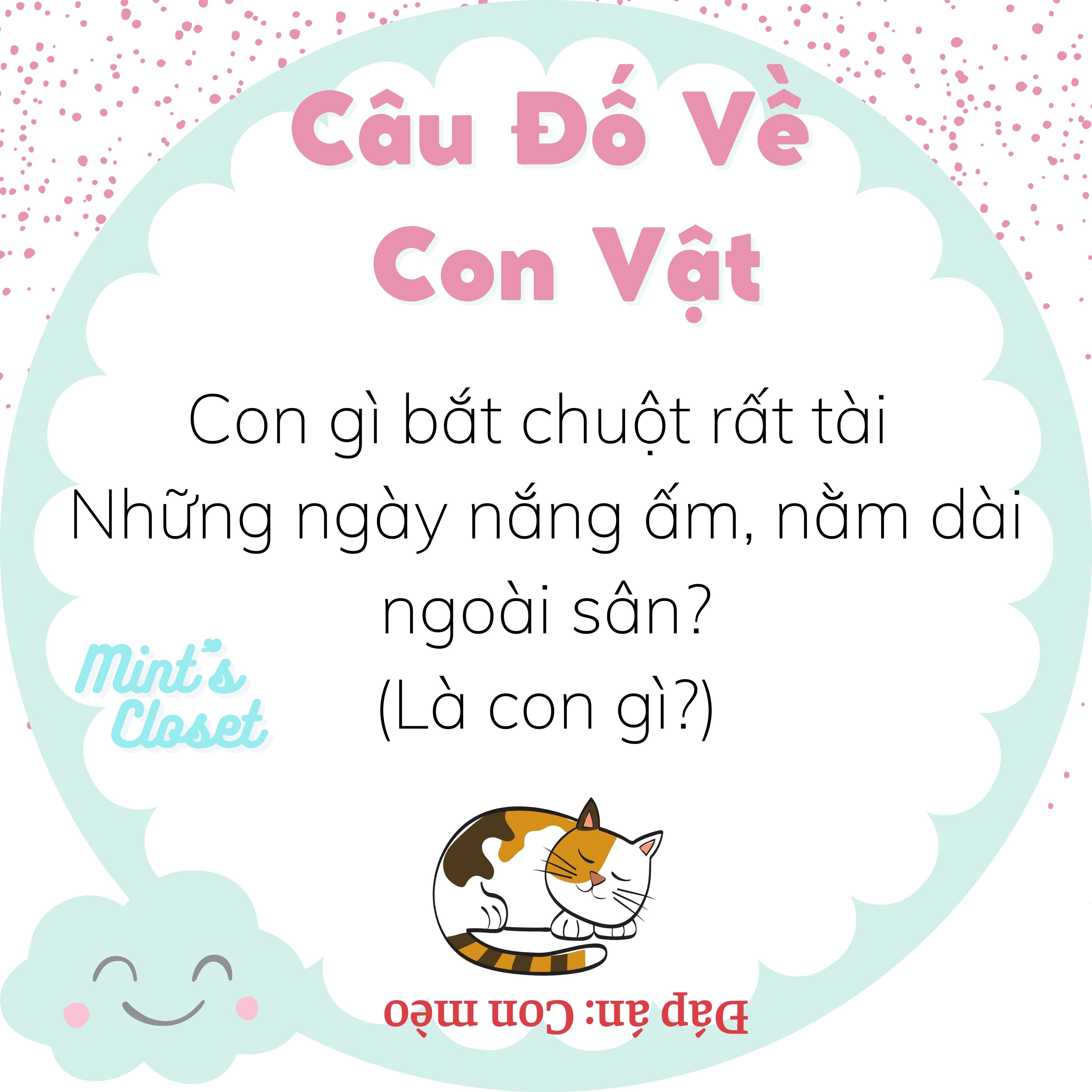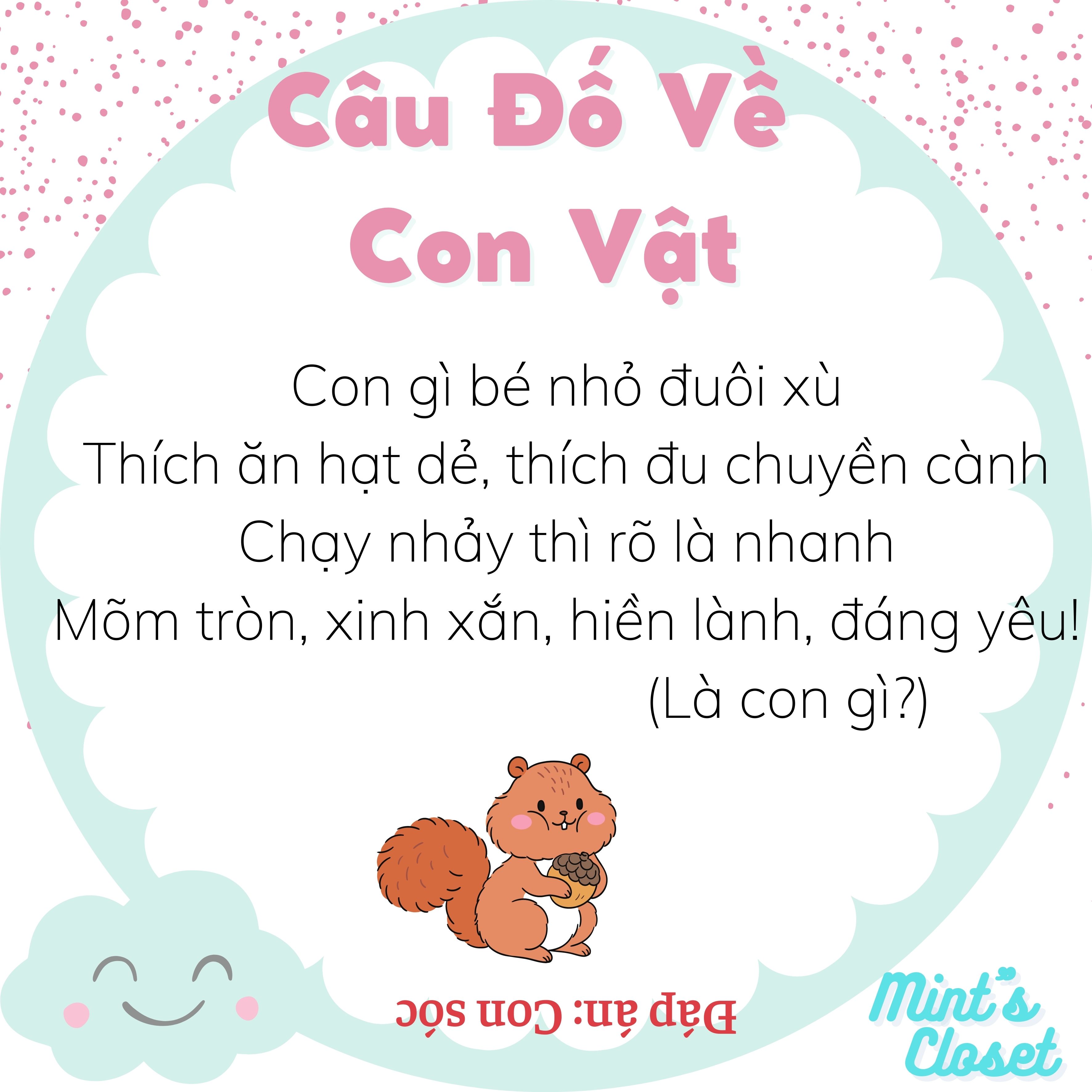 12.10.2021Những câu đố về con vật quen thuộc như cá, mèo, gà, vịt, thỏ, chó... dưới đây không chỉ bố mẹ có thêm trò giải trí để chơi với con mà còn có thể giúp trẻ phát triển tư duy ngôn ngữ, tăng khả năng ghi nhớ và tập trung ở trẻ.