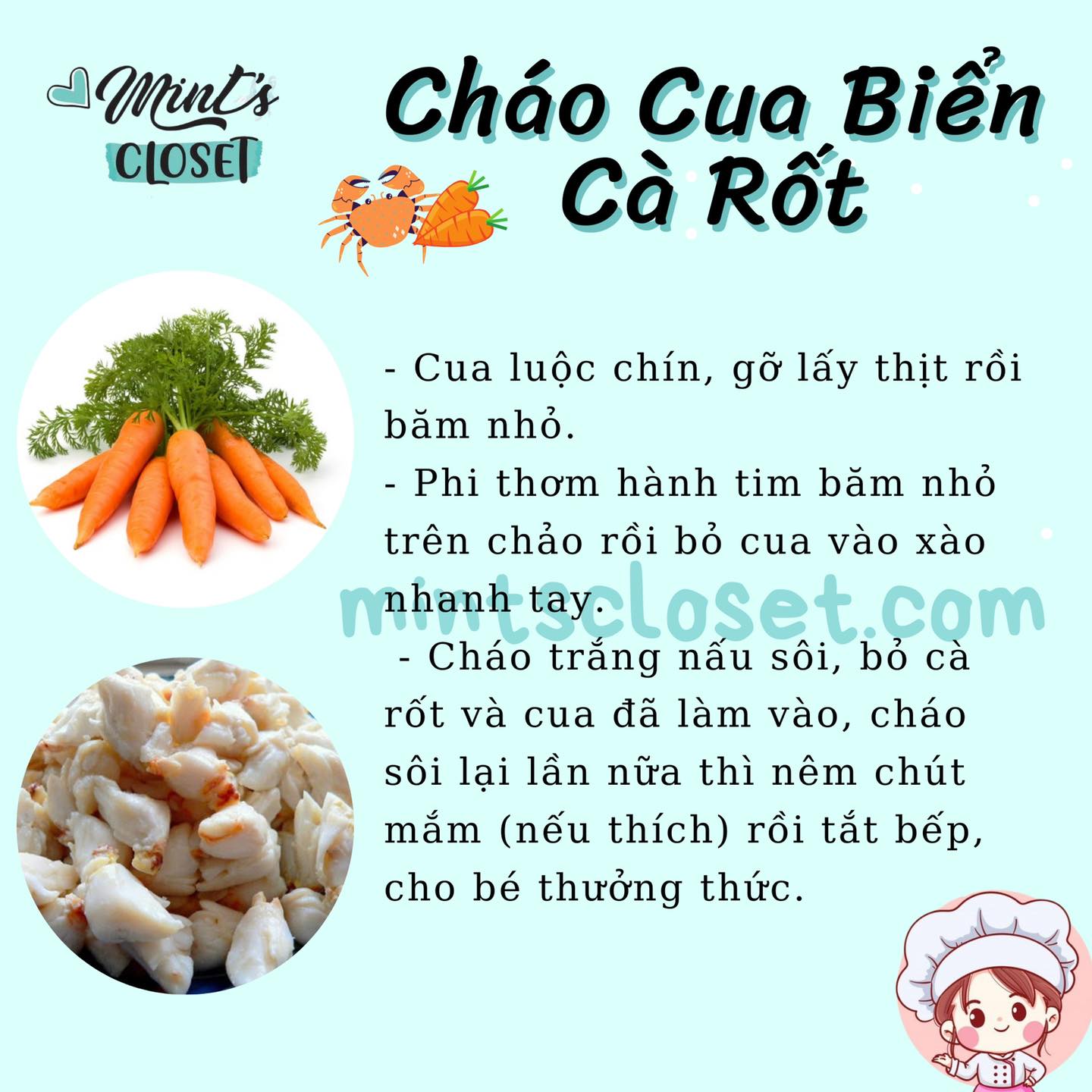 Cua biển có thể kết hợp với rất nhiều loại rau củ để tạo thành món cháo thơm ngon. Cụ thể, bạn có thể nấu cháo cua với cà rốt, mồng tơi, bí đỏ… Tùy vào sở thích và độ tuổi của trẻ mà bạn lựa chọn phù hợp.